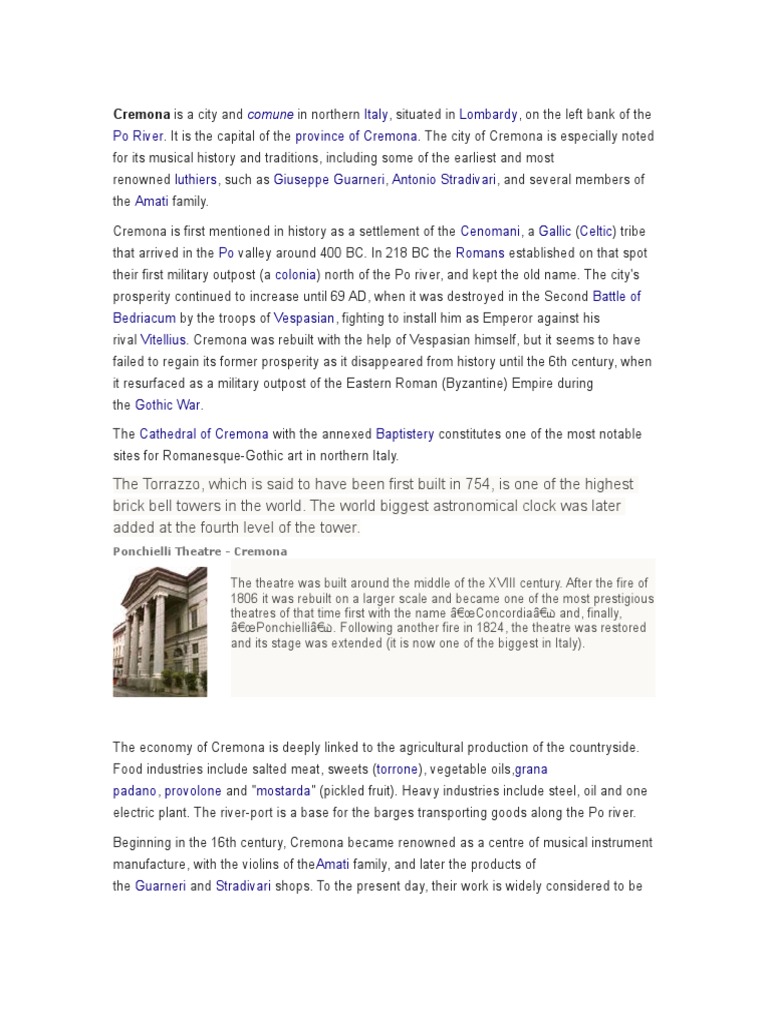 Po River. It is the capital of the province of Cremona. The city of Cremona is especially noted