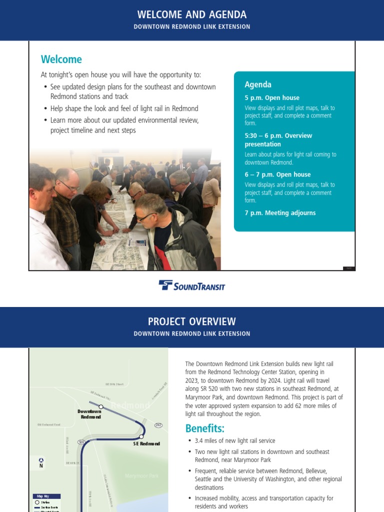 At tonight’s open house you will have the opportunity to:• See updated design plans for the southeast and downtown Redmond stations and track • Help shape the look and feel of light rail in Redmond• Learn more about our updated environmental review, project timeline and next steps