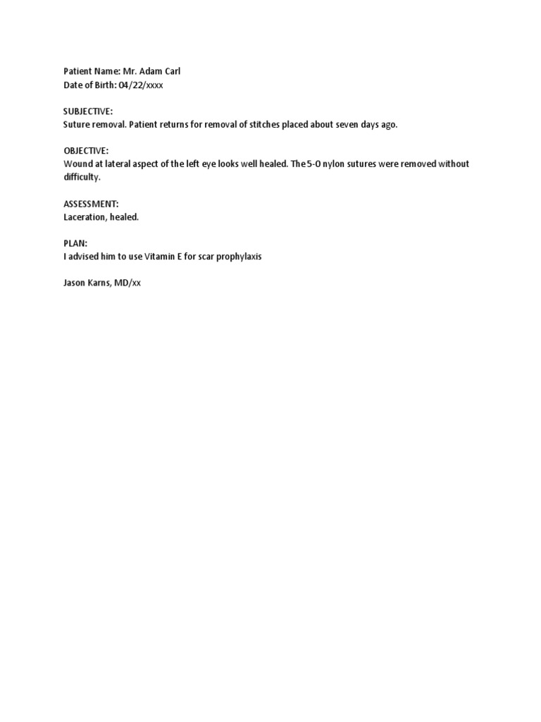 Suture removal. Patient returns for removal of stitches placed about seven days ago.