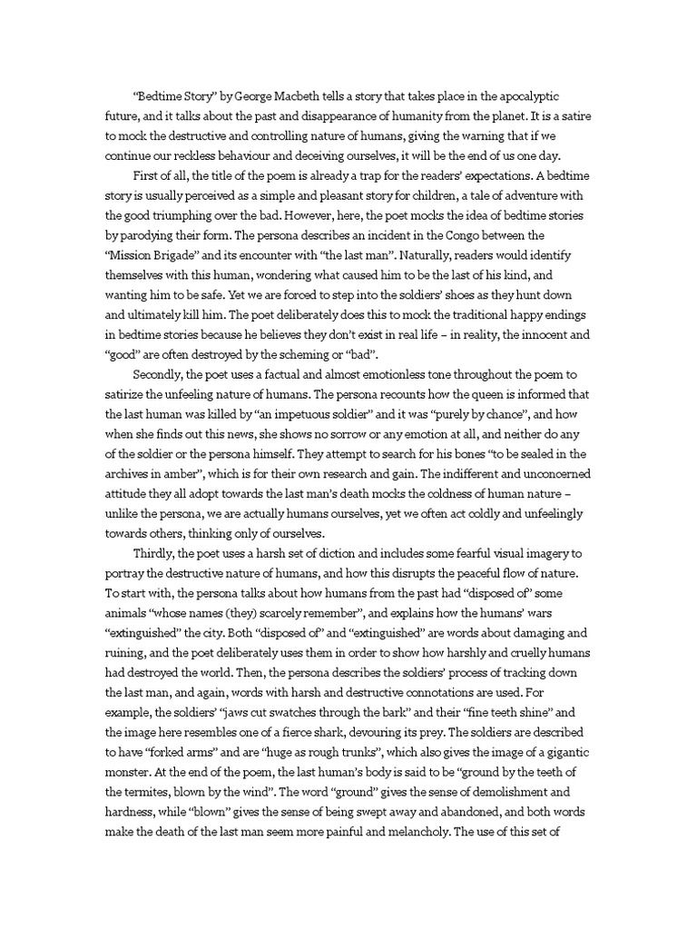 Bedtime Story by George Macbeth tells a story that takes place in the apocalyptic