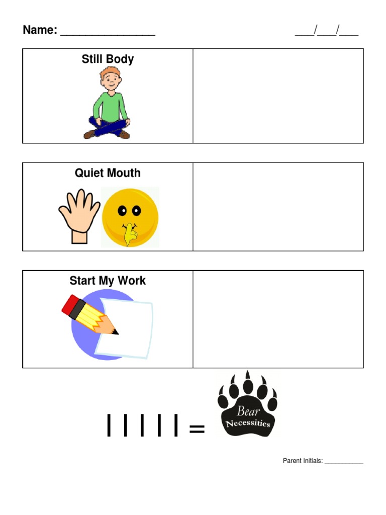 This document appears to be a checklist for a child with three items: "Still Body", "Quiet Mouth", and "Start My Work". It has spaces to fill in a name, date, and parent initials, suggesting it is meant to guide and monitor a child's behavior or activities.