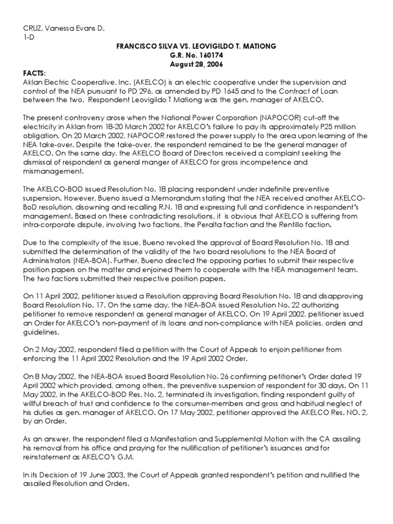 between the two. Respondent Leovigildo T Mationg was the gen. manager of AKELCO.