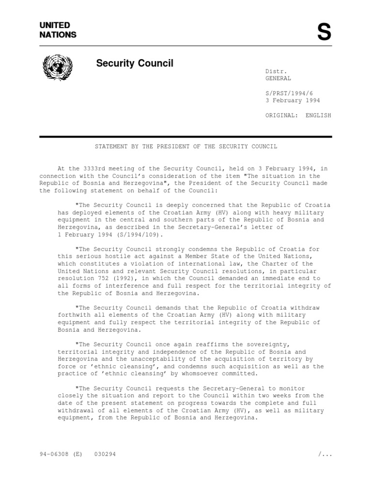 (S/PRST/1994/1), in which it expressed its deep concern at the continuing