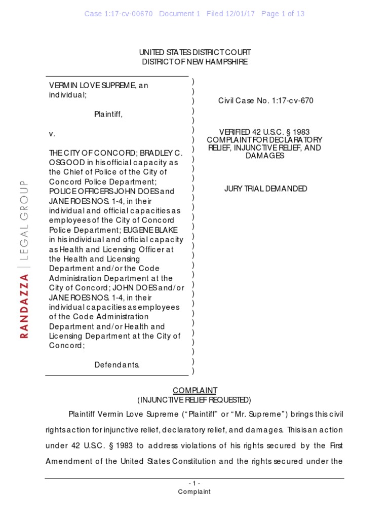 First Amendment Attorney Marc Randazza today filed suit in Federal District Court in New Hampshire against the city of Concord, New Hampshire on behalf of Vermin Supreme.