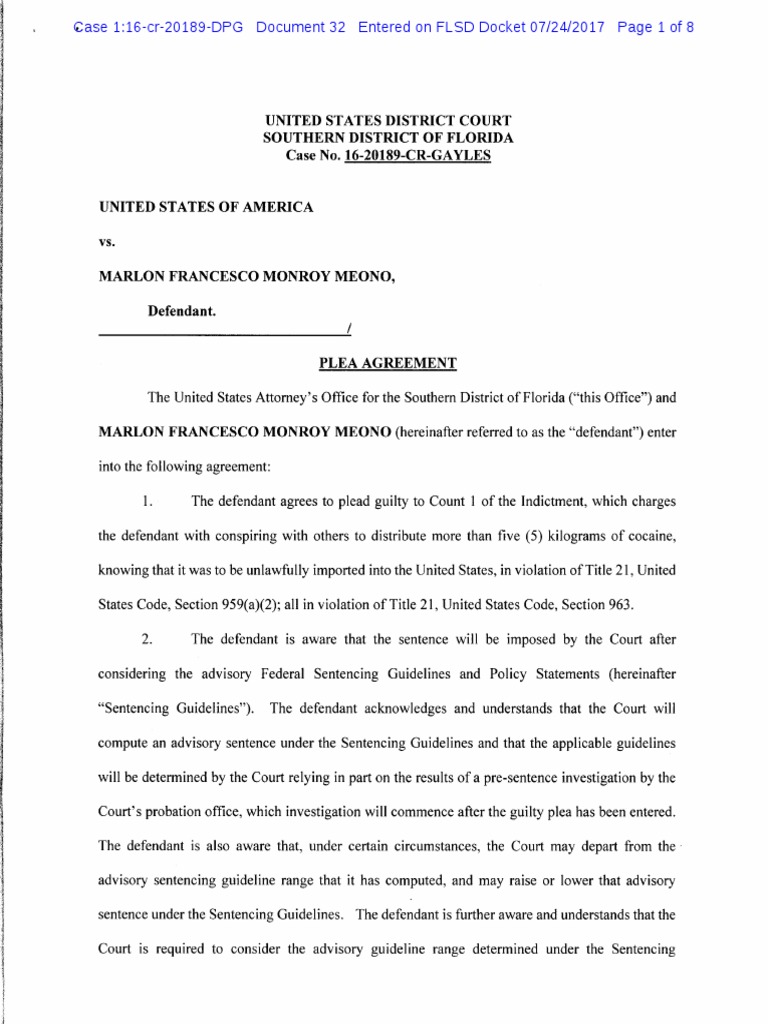 This document is a plea agreement between the United States Attorney's Office for the Southern District of Florida and Marlon Monroy Meono regarding a criminal case. Meono agrees to plead gu…