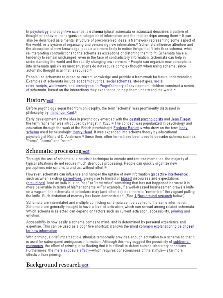 the world, or a system of organizing and perceiving new information. [2] Schemata influence attention and