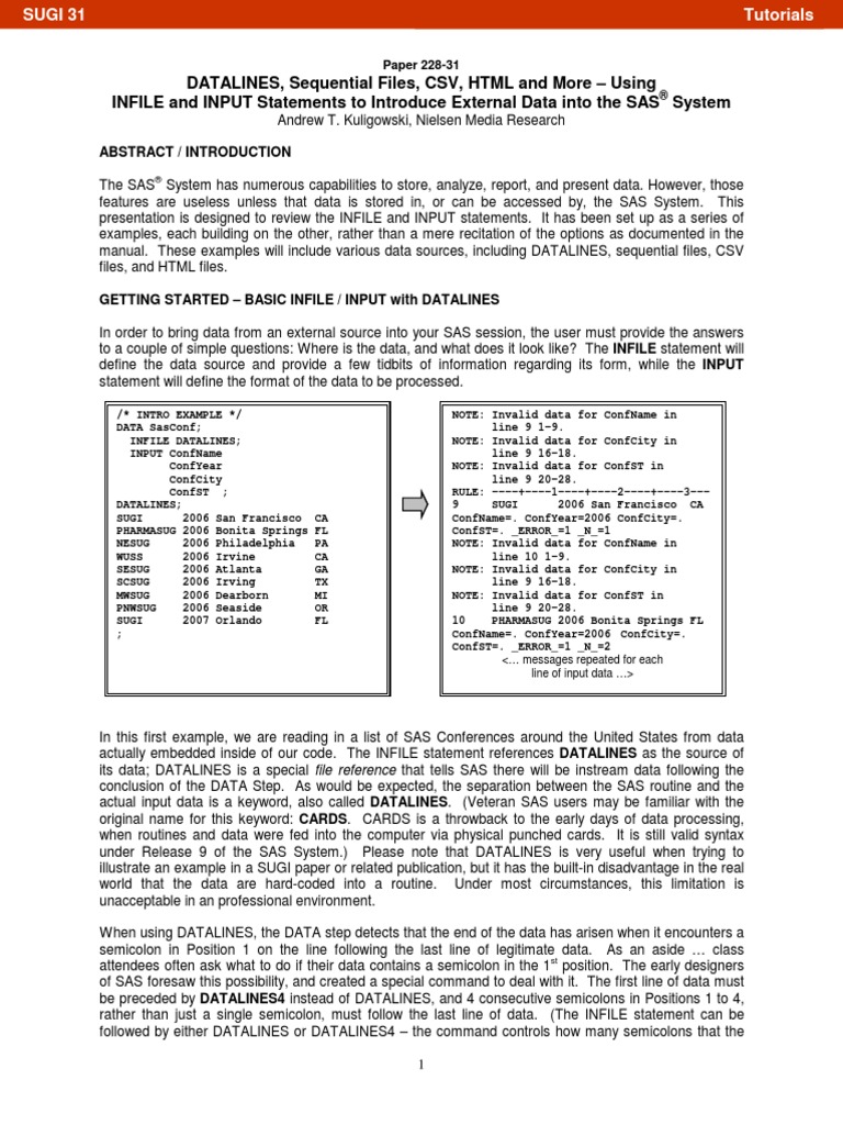 DATALINES, Sequential Files, CSV, HTML and More - Using INFILE and INPUT Statements To Introduce External Data Into The SAS System