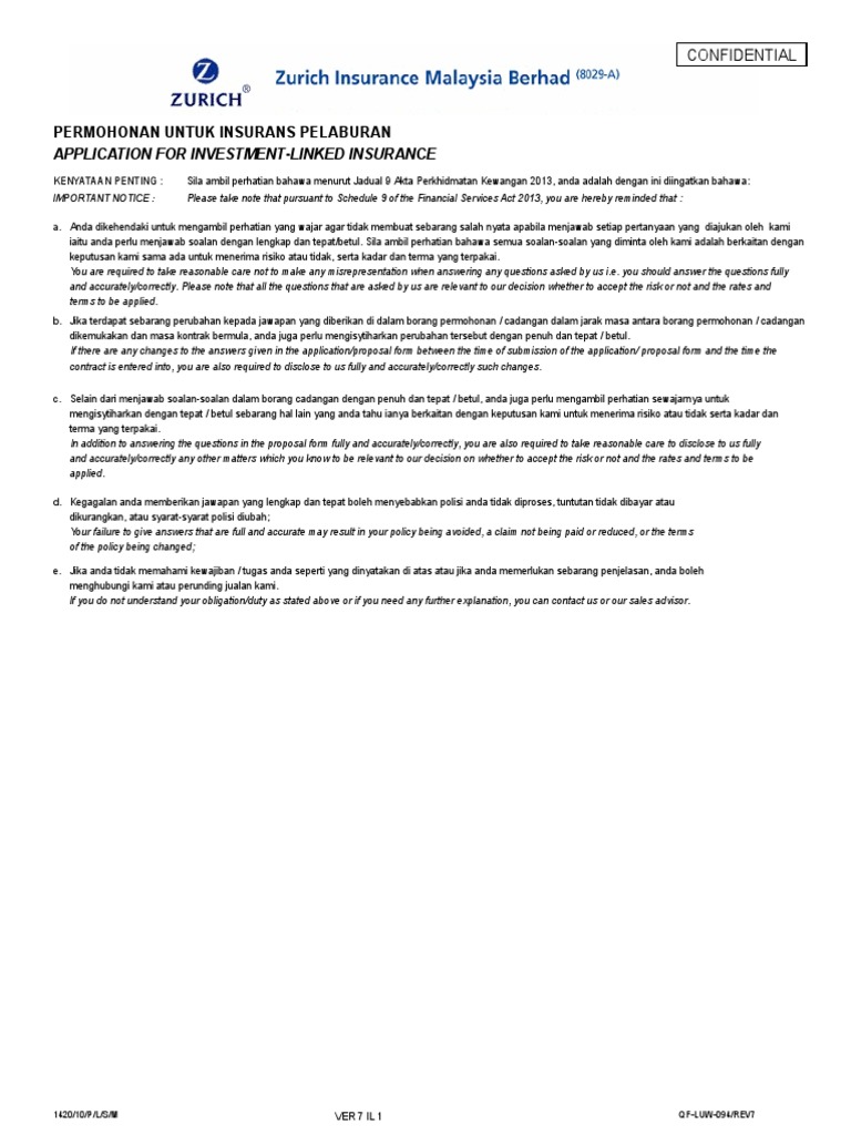 our health, to disclose to Zurich Insurance Malaysia Berhad or its representative any and all information about me/ Insured with reference to my/ our health and medical