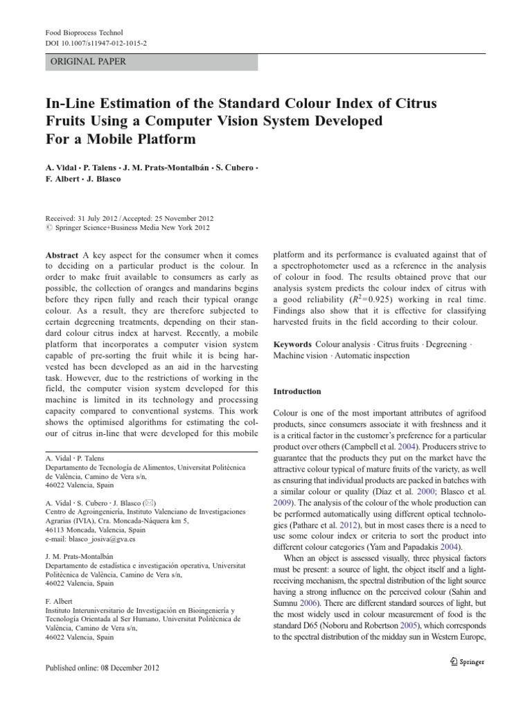 vision system to inspect the colour of citrus fruits in field Food and Bioprocess Technology, 5(8), 32443249.