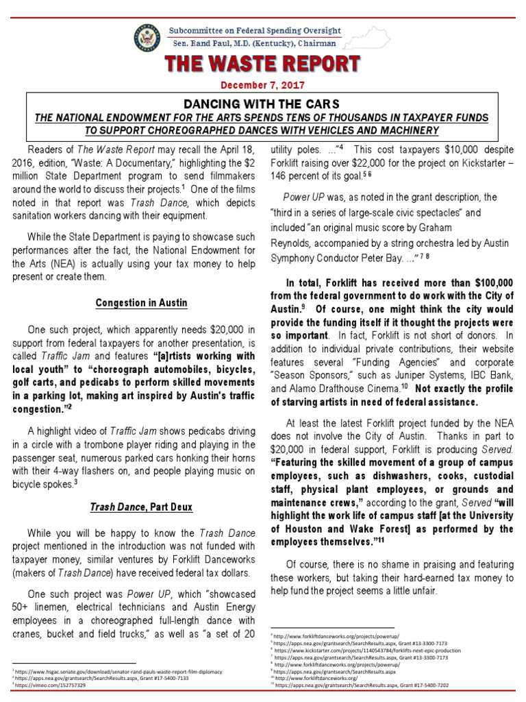 Following up on a 2016 Waste Report highlighting the U.S. State Department helping to fund documentary promotion internationally, the latest Waste Report examines productions taxpayers are s…Full description
