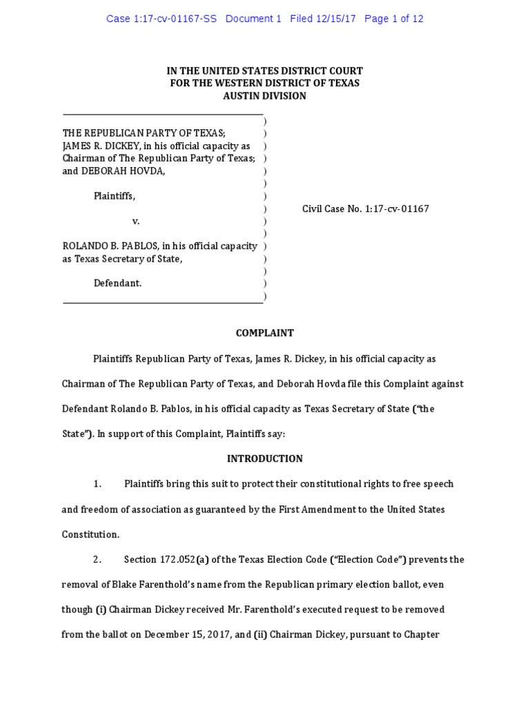 Chairman of The Republican Party of Texas, and Deborah Hovda file this Complaint against