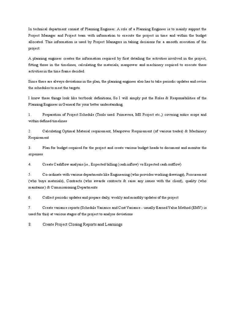 In technical department consist of Planning Engineer: A role of a Planning Engineer is to mainly support the