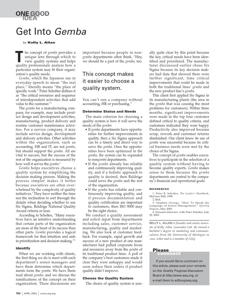 how well it serves the gemba.2 If the gemba already has reliable quality system without having to