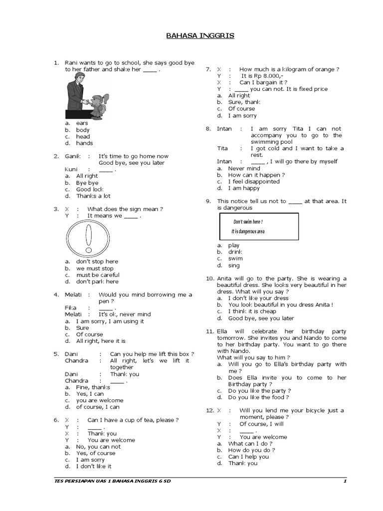 TES PERSIAPAN UAS 1 BAHASA INGGRIS 6 SD 1