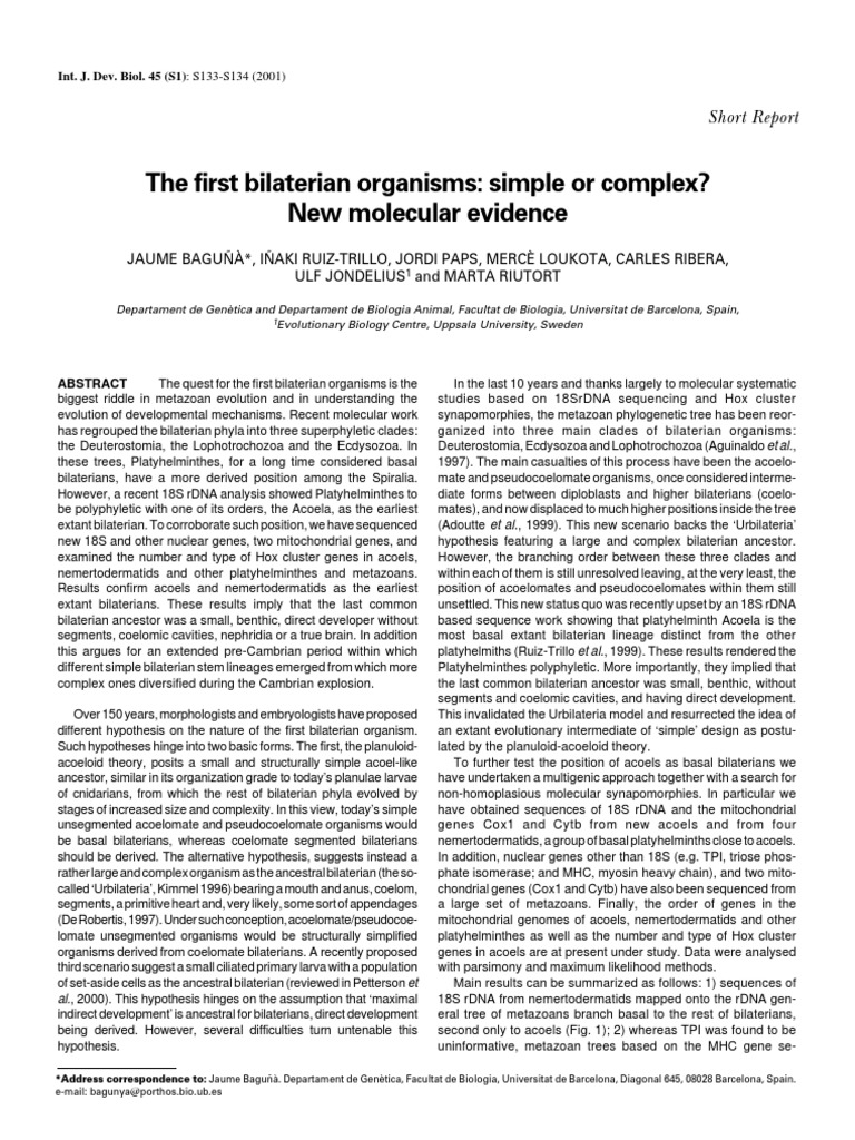 new 18S and other nuclear genes, two mitochondrial genes, and hypothesis featuring a large and complex bilaterian ancestor.