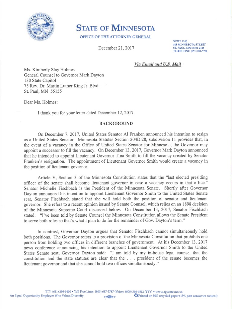 Attorney General Lori Swanson’s opinion says there’s a good legal case Michelle Fischbach can’t remain a state senator if she moves into the lieutenant governor’s job.
