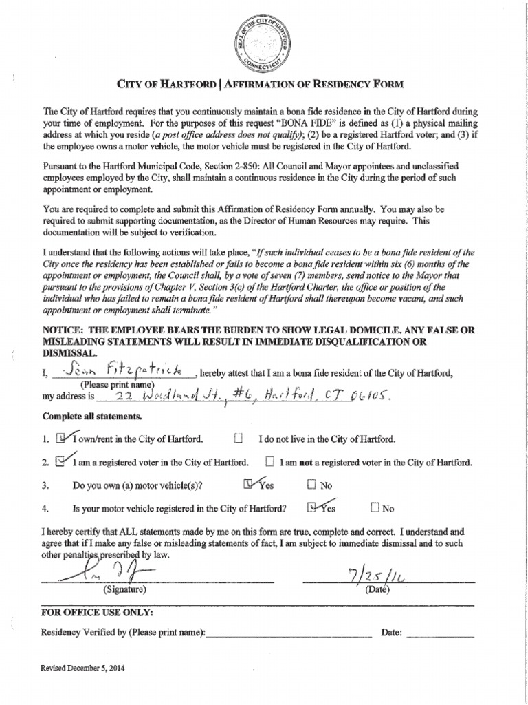 SEAN FITZPATRICK RESIDENCY AFFIDAVIT