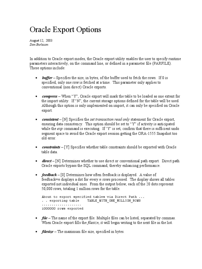 In addition to Oracle export modes, the Oracle export utility enables the user to specify runtime