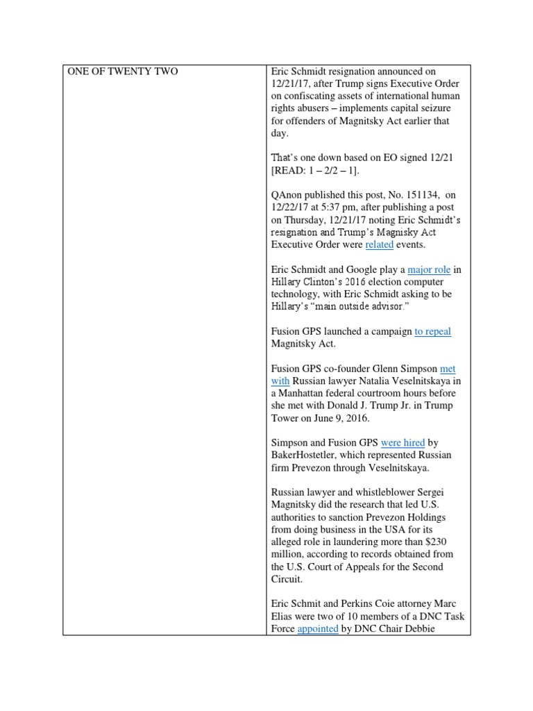 1]. QAnon published this post, No. 151134, on 12/22/17 at 5:37 pm, after publishing a post on Thursday, 12/21/17 noting Eric Sch