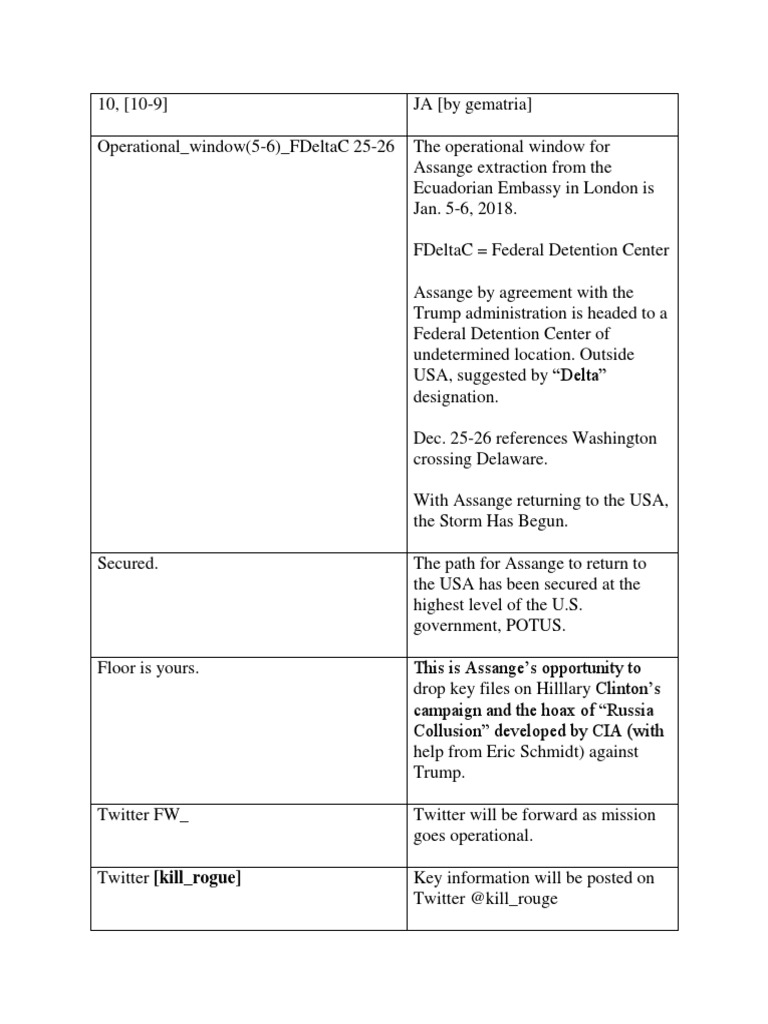 designation. Dec. 25-26 references Washington crossing Delaware. With Assange returning to the USA, the Storm Has Begun. Secured. The path for Assange to return to the USA has been secured at the highest level of the U.S. government, POTUS. Floor is yours.