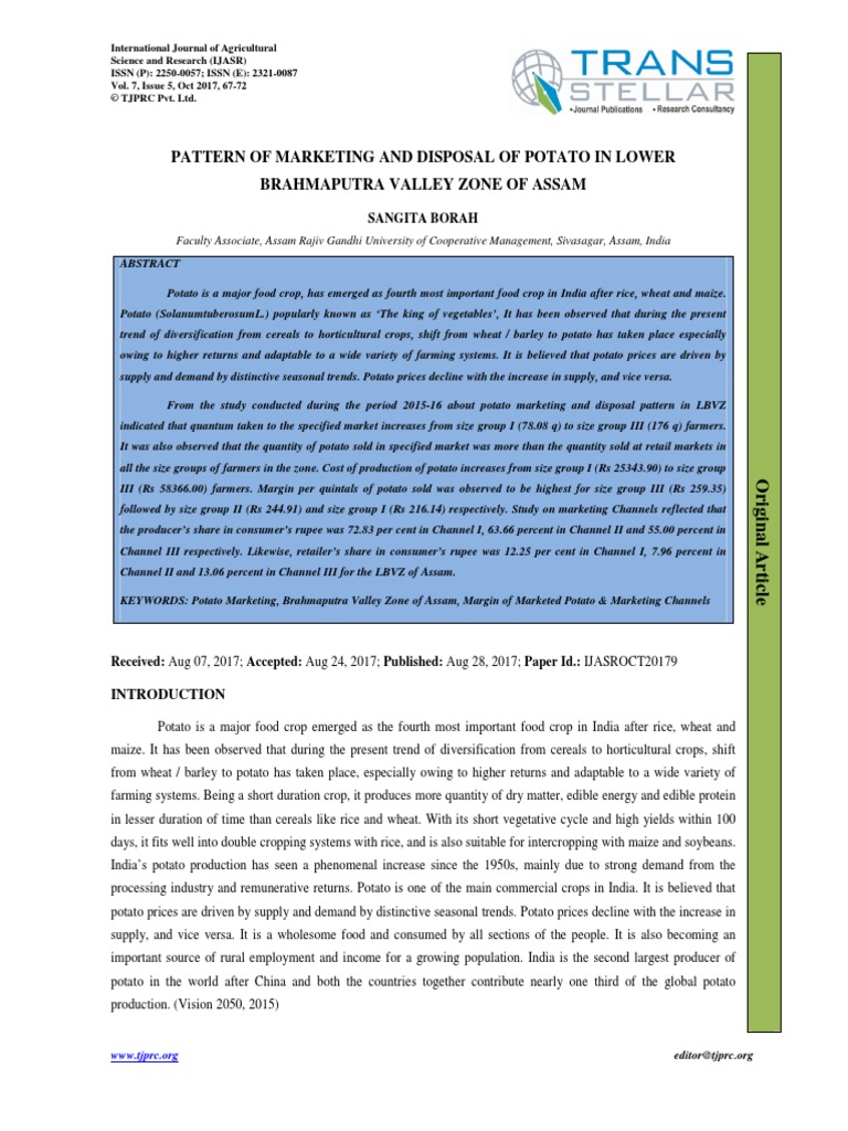 The present paper examines the potato marketing and disposable pattern in the Lower Brahmaputra Valley Zone