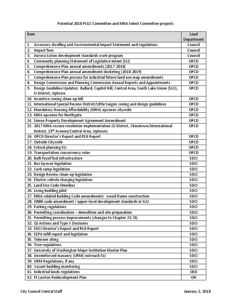 City Council Central Staff January 2, 2018 Potential 2018 PLUZ Committee and MHA Select Committee projects Item Lead Department 1.