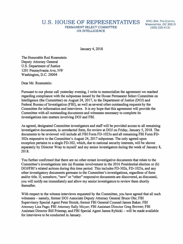 Janay 4, 2018 The Honorabl Rod osnstein Depty Attoey Geera U.S Departmnt of stic 1201 Pennylvania Ave, NW Washington, DC 20004 Dear Mr Ronstin: Prant to ou phon cal ystrday evenng I wite to memorializ the agreement we race rgaring compianc with the spoenas ise by th Hou Prmanent Select Comittee on Inteligenc (the Comite) on Agst 24 2017 to the Depatment of Jtic (DOJ) an Feera Bra ofnestigaton (FBI), as we as evral other otstanding reqests by th Committe r inoration an interview It i my hop that this agrement wil provie th Commitee with al tstning docments an witness necessay to complet its invetigations into matrs involving DOJ and FBI As agr signat Committee investigators an sta wil be provied access to all rmaining inestigativ docmnt, in eacted m, r reviw at DOJ on Friday Janay 5, 2018 The ocments to be reviewed wi incle al FBI Form FD- 023s an all remaining FBI Fom D 302s responsive to te Comitee's Agst 24, 2017 bponas. The only agrpon exception prtain to a inge FD302 which e to nationa ecrity intersts, wil be show spaatey by Dirctr Wray to mysef and my senior invstigator dring th week of Janary 8 208 Yo ther conrmd that tr ar no othr extant investigative ocments that relate to the Committees invstigation into (a) Rssian invovement in the 2016 Prsidential elction or (b) DOJ/FBI reate ations ring this time period This incdes FD302 FD023s an any other investigatory mnt gemane to the Committs invstigation regrdless of rm and/or titl I somhow "nw or "other responsive ocments ar iscovered, as iscssd yo wil noti me imiatey and allow my snior invtigators to review them shorty threar With respect to the itnss interview rqeste by th Committee yo hav agr that a ch witneses naey mer DOJ Associate Depty Attoey Genera rce Ohr; FI Sprvisory Special Agnt Ptr Strzok mer FBI Gneral Consel Jame Baker FBI L D Bowr FBI Assistant Director Bill Prietap an FB Spcial Agnt James ybicki wil b ma avaia r interview to b ondct in Janary