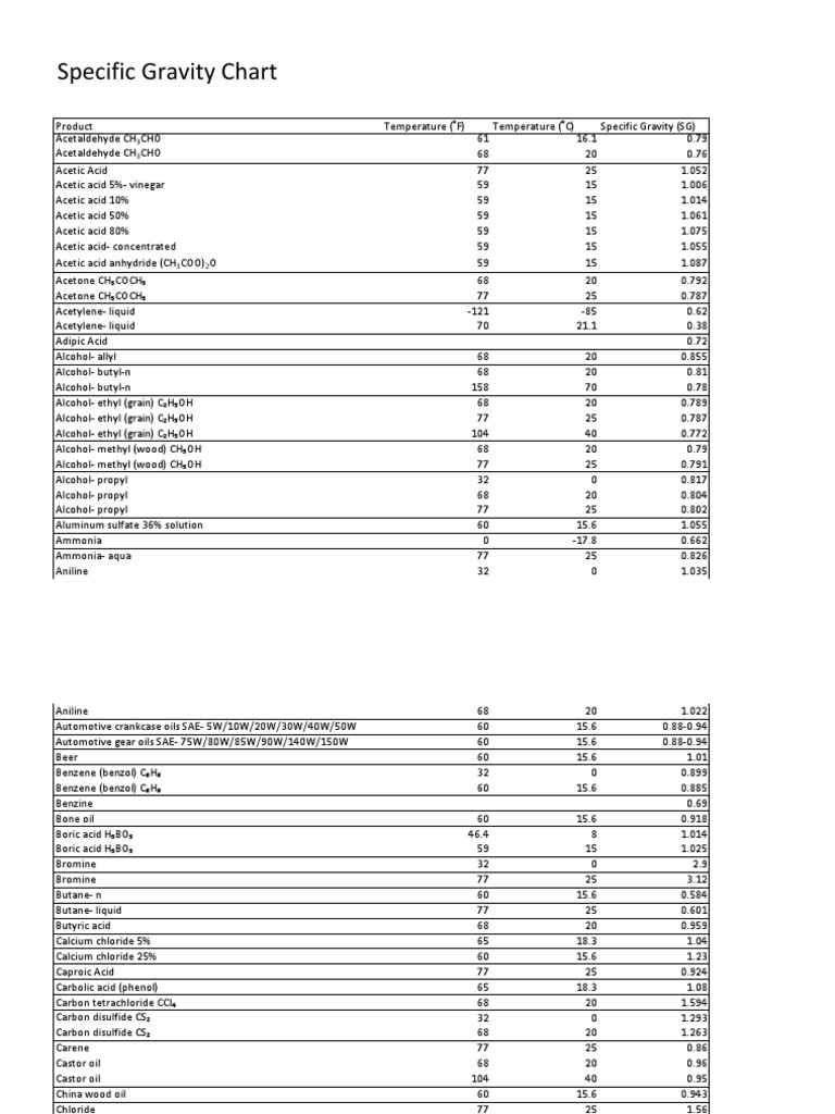 Specific Gravity Chart