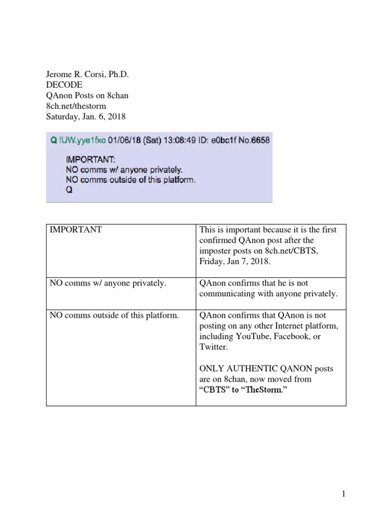1 Jerome R. Corsi, Ph.D. DECODE QAnon Posts on 8chan 8ch.net/thestorm Saturday, Jan. 6, 2018 IMPORTANT This is important because it is the first confirmed QAnon post after the imposter posts on 8ch.net/CBTS, Friday, Jan 7, 2018. NO comms w/ anyone privately. QAnon confirms that he is not communicating with anyone privately. NO comms outside of this platform. QAnon confirms that QAnon is not posting on any other Internet platform, including YouTube, Facebook, or Twitter. ONLY AUTHENTIC QANON posts are on 8chan, now moved from