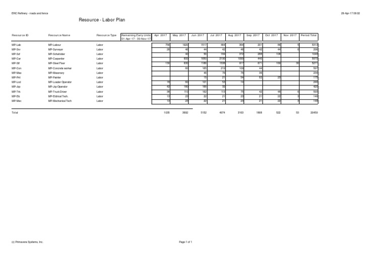 Resource ID Resource Name Resource Type Remaining Early Units Apr 2017 May 2017 Jun 2017 Jul 2017 Aug 2017 Sep 2017 Oct 2017 Nov 2017 Period Total