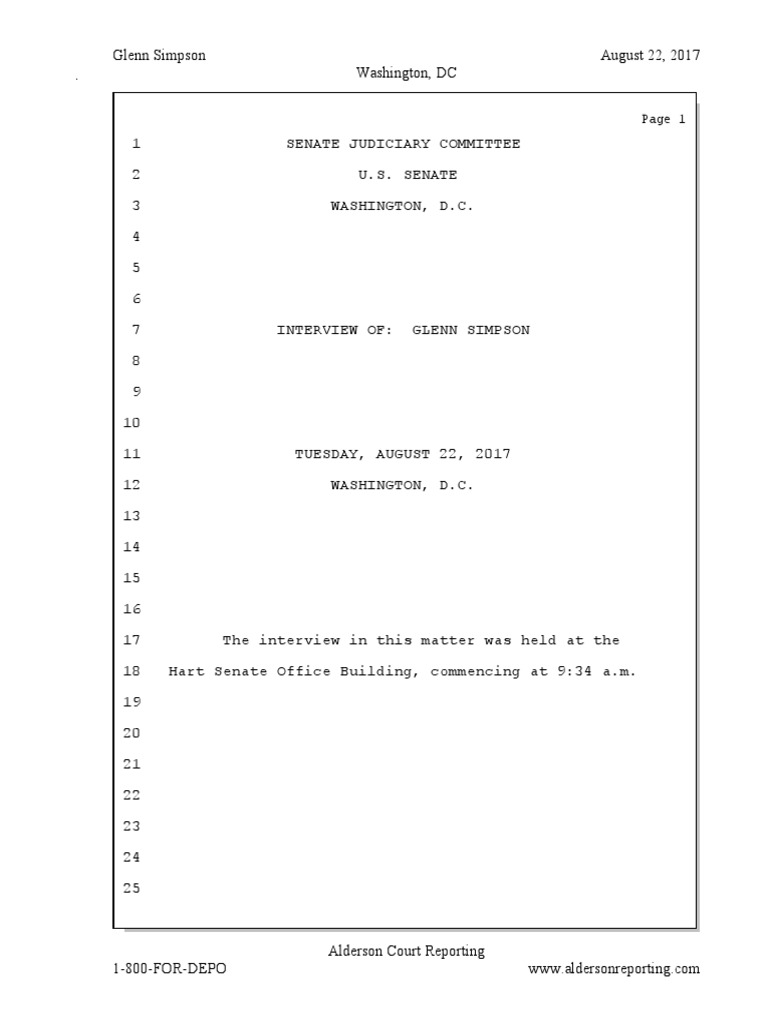1 SENATE JUDICIARY COMMITTEE2 U.S. SENATE3 WASHINGTON, D.C.4567 INTERVIEW OF: GLENN SIMPSON891011 TUESDAY, AUGUST 22, 201712 WASHINGTON, D.C.1314151617 The interview in this matter was held at the 18Hart Senate Office Building, commencing at 9:34 a.m.19202122232425