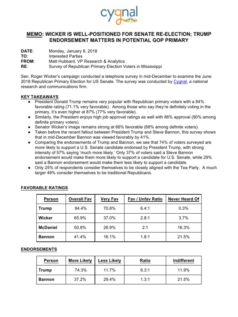 MEMO: WICKER IS WELL-POSITIONED FOR SENATE RE-ELECTION; TRUMP