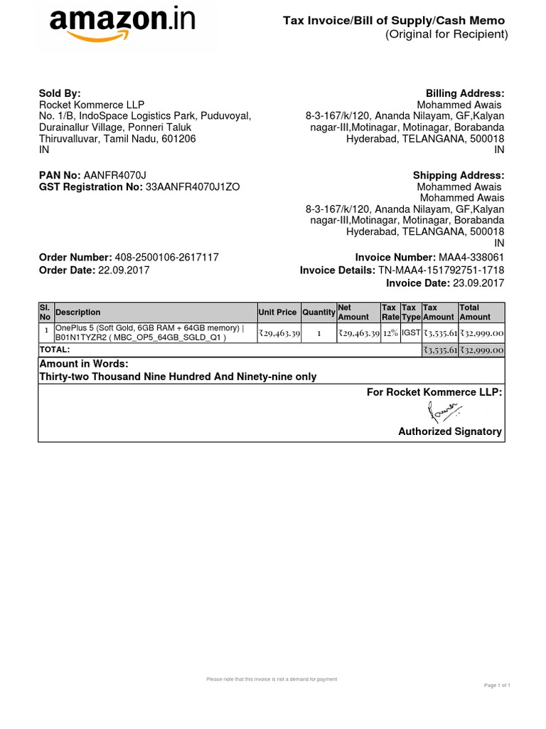1 OnePlus 5 (Soft Gold, 6GB RAM + 64GB memory) | ₹29,463.39 1 ₹29,463.39 12% IGST ₹3,535.61 ₹32,999.00