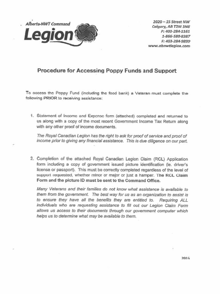 2. Completion of the attached Royal Canadian Legion Claim (RCL) Application