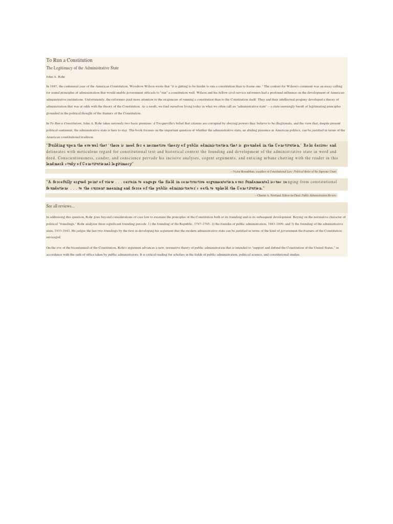 In To Run a Constitution, John A. Rohr takes seriously two basic premises: d Tocqueville's belief that citizens are corrupted by ebeying powers they believe to be illegitimate, and the view that, despite present