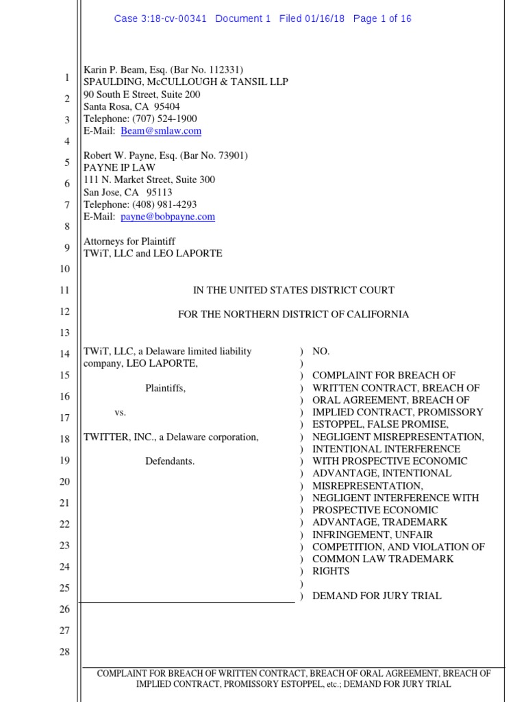 15 any of them, specifically perform the agreement made between Plaintiffs and defendant Twitter;