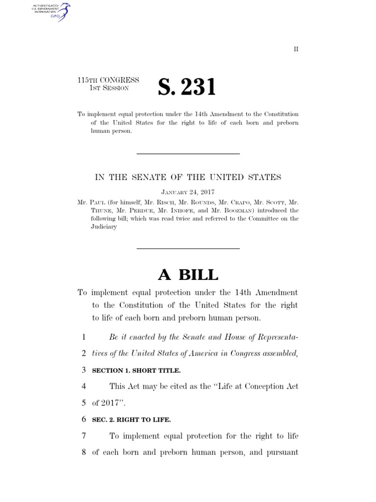To implement equal protection under the 14th Amendment to the Constitution of the United States for the right to life of each born and preborn human person.