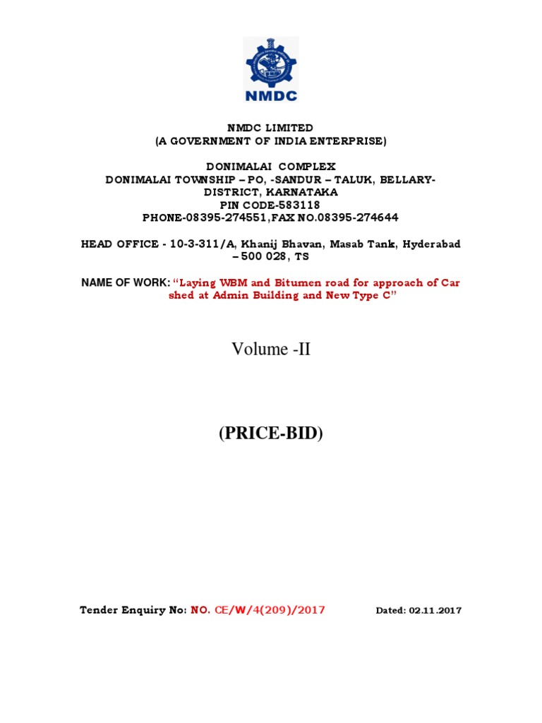Tender Enquiry No: NO. CE/W/4(209)/2017 Dated: 02.11.2017