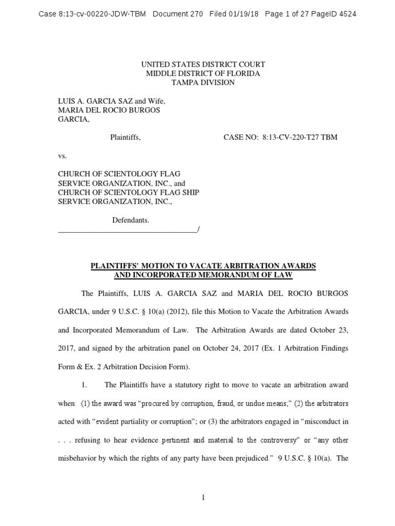 1 UNITED STATES DISTRICT COURT MIDDLE DISTRICT OF FLORIDA TAMPA DIVISION LUIS A. GARCIA SAZ and Wife, MARIA DEL ROCIO BURGOS GARCIA, Plaintiffs, vs. CHURCH OF SCIENTOLOGY FLAG SERVICE ORGANIZATION, INC., and CHURCH OF SCIENTOLOGY FLAG SHIP SERVICE ORGANIZATION, INC., Defendants. ____________________________________/ CASE NO: 8:13-CV-220-T27 TBM