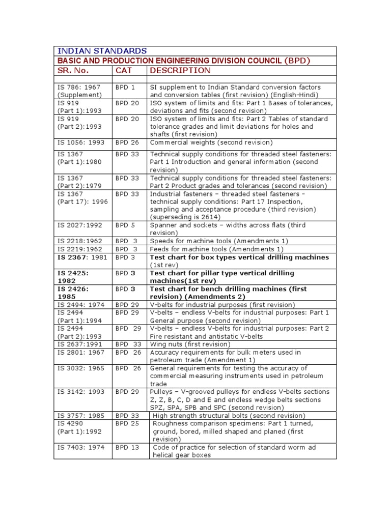 IS 919 BPD 20 ISO system of limits and fits: Part 2 Tables of standard