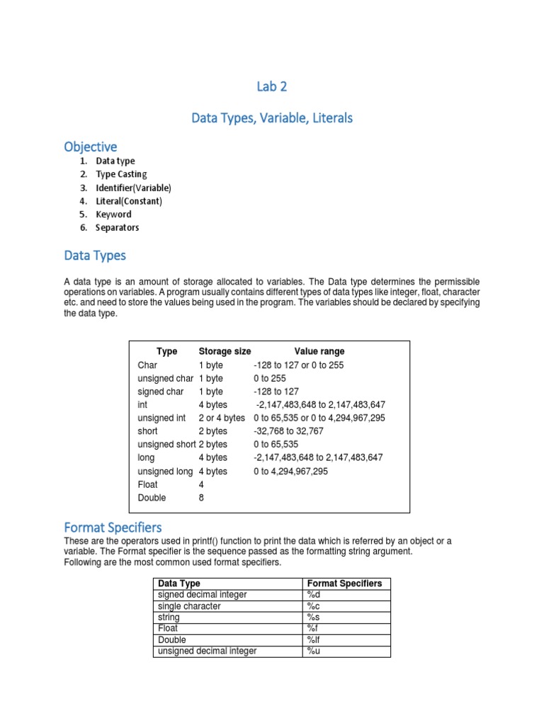 operations on variables. A program usually contains different types of data types like integer, float, character