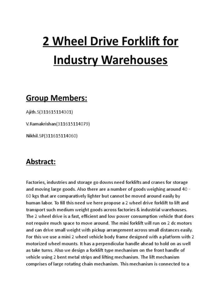human labor. To fill this need we here propose a 2 wheel drive forklift to lift and