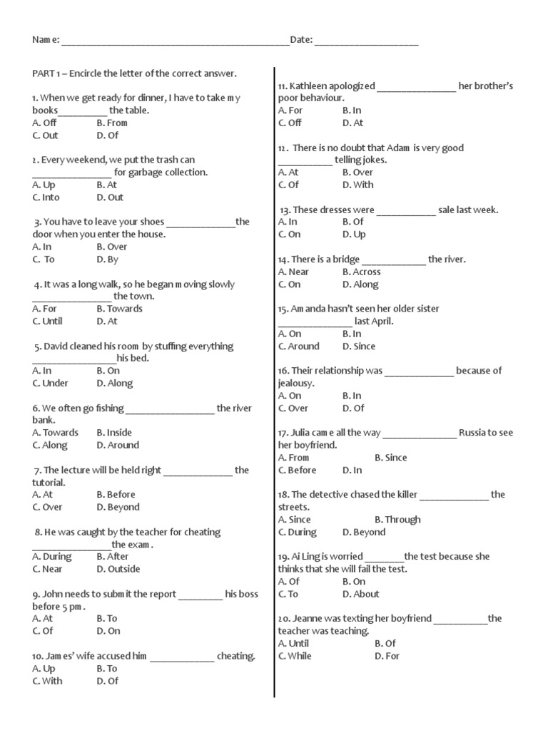 Part 2 – Choose the correct preposition from the box. Part 3 – Choose the prepositional phrase that best fit to
