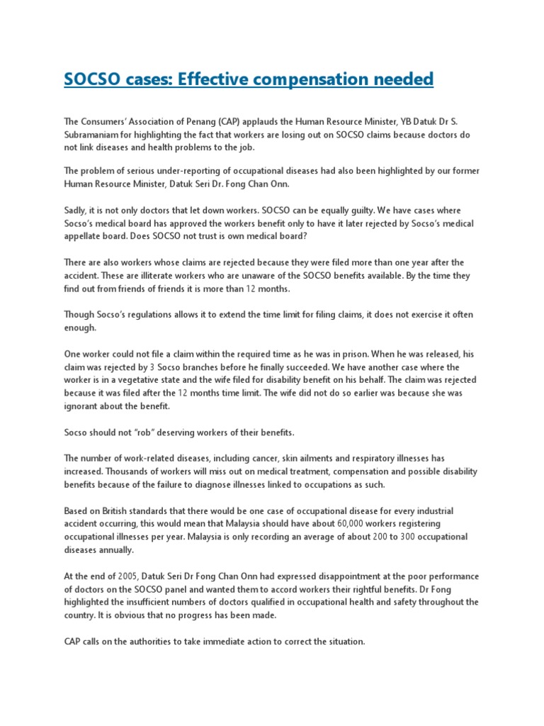 related disease and need treatment. Socso claims can be evaluated and processed using a standard