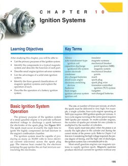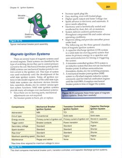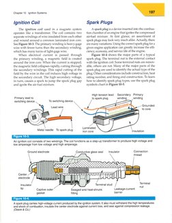 Ignition Systems Overview: Provides learning objectives, key terms, and the purpose of ignition system components. Ignition System Components: Describes the ignition system components including spark plugs and ignition coils, with diagrams illustrating their functions. Magneto Ignition Systems: Explains different systems of magneto ignition and compares mechanical breaker and electronic systems. Capacitive Discharge Ignition System: Details the operation of the capacitive discharge ignition system, explaining its components and process. Mechanical Breaker Point Ignition System: Illustrates the mechanical breaker point ignition system, focusing on its components and operation. Battery Ignition Systems: Examines battery ignition systems, showing setup and flow of electricity through diagrams. Summary and Review Questions: Summarizes the key points of ignition systems and presents review questions for knowledge testing. Workbook Exercises: Includes exercises and questions related to the ignition systems for practical student engagement. CHA