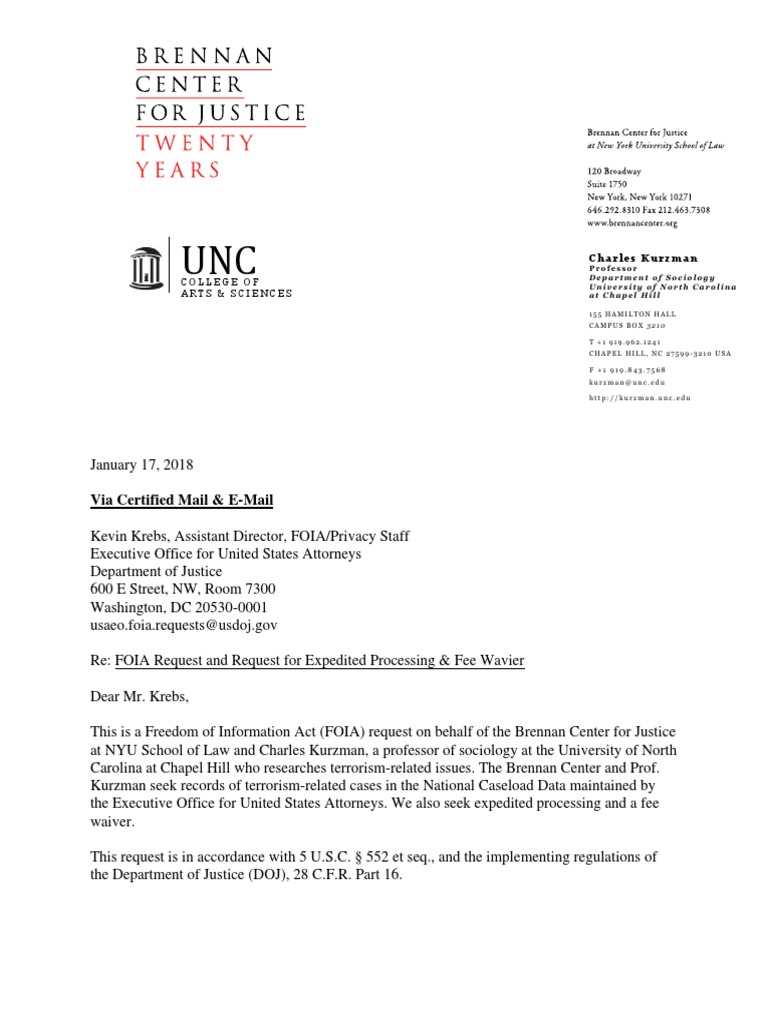 Brennan Center Files FOIA Seeking Terrorism Data Maintained by The Executive Office For United States Attorneys
