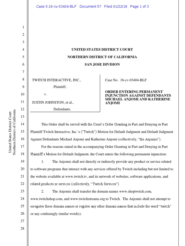 The court document orders a permanent injunction against defendants Michael and Katherine Anjomi related to a case with Twitch Interactive, Inc. Specifically, it orders that the Anjomis cann…