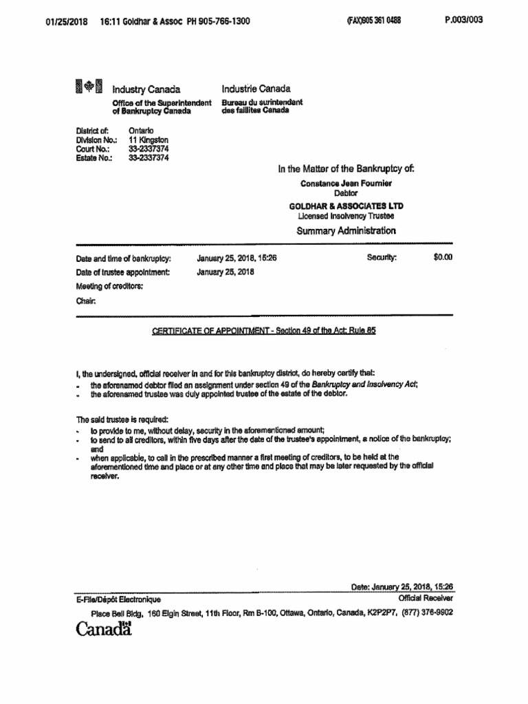 $0.00CERTIFICATE OF APPOINTMENT- Section 49 of the Act: Rule 65I, the undersigned, offida receiver In and for this bankruptcy district, do hereby certify that:- the aforenamed debtor filed an assl^roent under section 49 of the Bankruptcy and Insolvency Act,- the aforenamed trustee was duly appointed trustee of the estate of the debtor.The said trustee is required:- to provide to me, without delay, security in the aforementioned amount;• to send to aB creditors, within five days after the date of the trustee's appointment, a notice of the bankruptcy;and- when applicable, to call hi the prescribed manner a first meeting of creditors, to be held at theaforementioned time and place or at any other time and place that may be later requested by the officialreceiver.Date: January 25,201ft, 15:26B-Rle/Dep6t Etectronkjue Official ReceiverPlace Bell BIdg. 160 Elgin Street, 11th Floor, Rm B-100, Ottawa, Ontarfor Canada, K2P2P7, (877) 376-9902