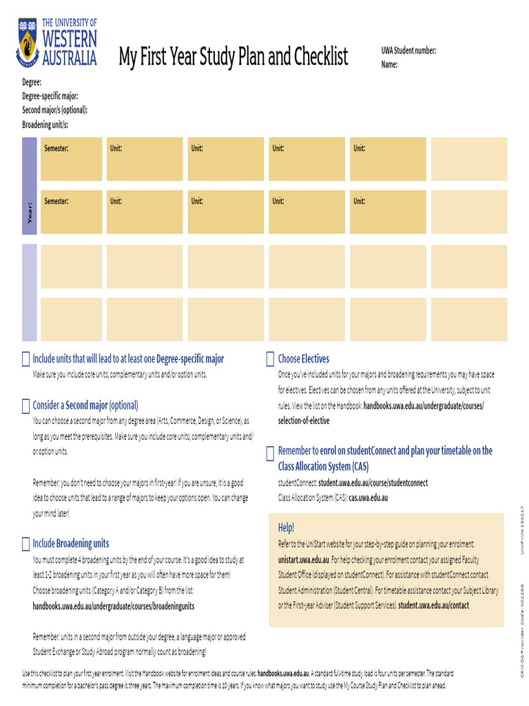 Use this checklist to plan your first year enrolment. Visit the Handbook website for enrolment ideas and course rules: handbooks.uwa.edu.au. A standard full-time study load is four units per semester. The standard