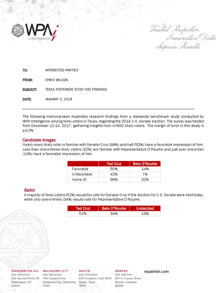 WPA Intelligence among likely voters in Texas, regarding the 2018 U.S. Senate election. The survey was fielded